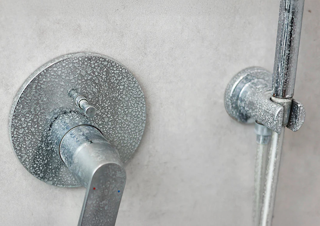 White, chalky buildup on bathroom fixtures